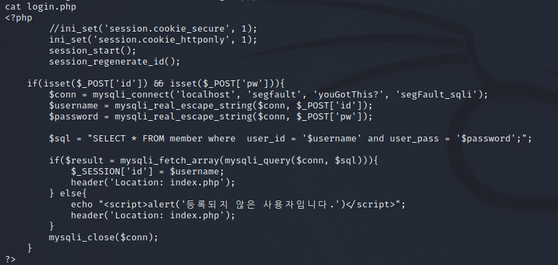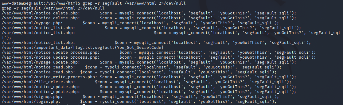 $conn = mysqli_connect('localhost', 'segfault', 'youGotThis?', 'segFault_sqli');