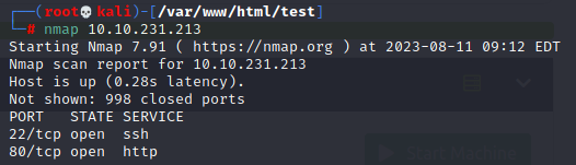 먼저 tryhackme에서 제공한 vm머신이 어떤 서비스를 하는지 알기 위해 nmap을 통해 열려있는 포트를 확인했다.