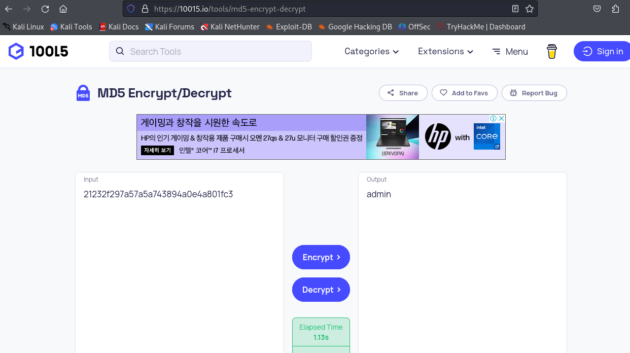 다시 MD5 Decrpt 온라인 사이트에 접속하여 복호화를 해보자