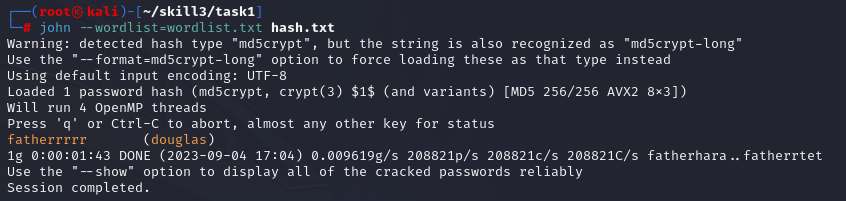 실행이 끝나면 douglas의 password는 fatherrrrr 임을 알려준다