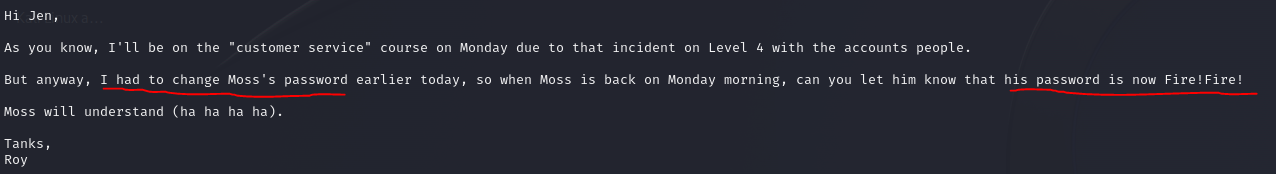 moss의 passwd 가 Fire!Fire! 라는것을 알 수 있다.