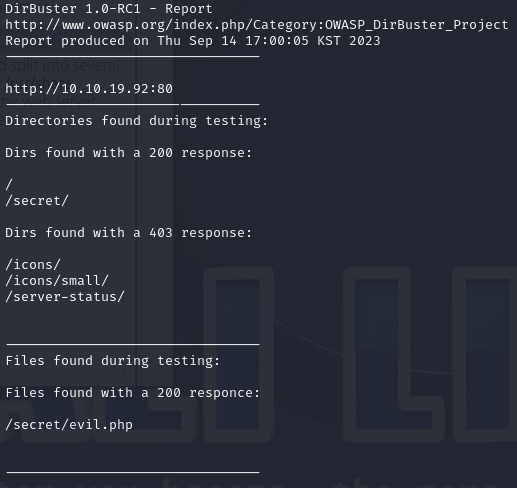 해당 사이트를 dirbuster를 사용하여 디렉터리 스캔을 진행해 보았다.