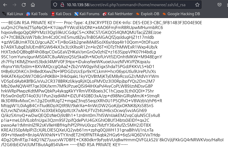 ffuf -u http://10.10.139.58/secret/evil.php?FUZZ=ls -w rockyou.txt -fs 0