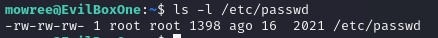 가장 중요한 정보로서는 /etc/passwd 파일이 쓰기가 가능한 파일임을 알려준다