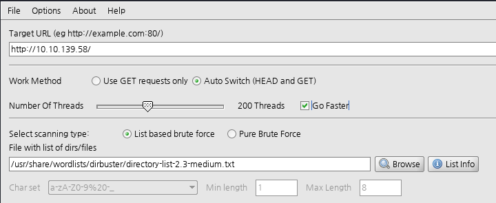 File whith list of dirs/files에는 /usr/share/wordlists/dirbuster/ 경로의 원하는 파일을 선택하여 넣어주면 된다