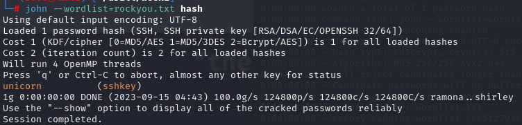 #ssh2john을 사용하여 sshkey파일을 hash라는 이름의 파일로 만들어 줌