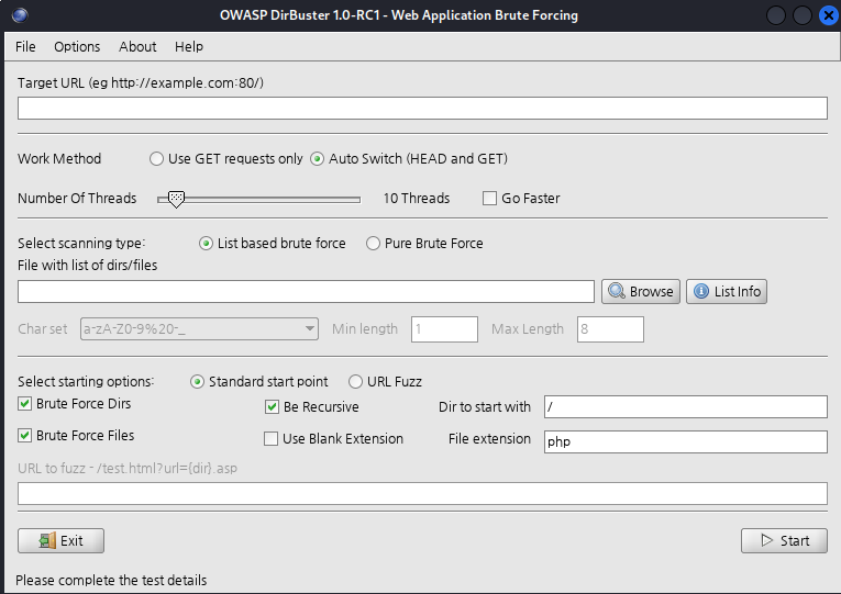 터미널에서 dirbuster라고 입력을 하게 되면 해당 GUI를 확인할 수 있다.
