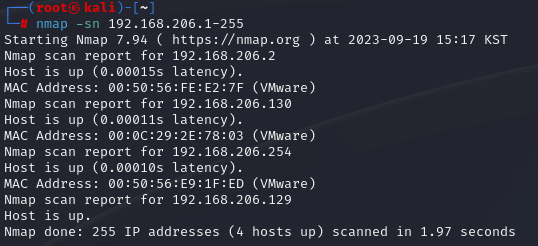 해당 명령어를 입력하면 네트워크 대역의 살아있는 host들이 스캔이 된다