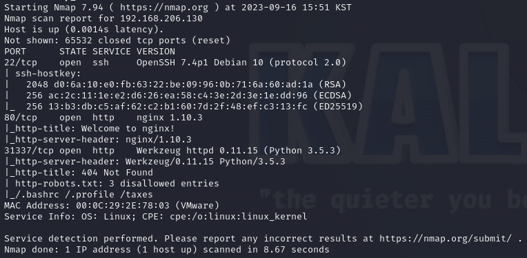 여기서 실습 머신의 ip를 찾아내야 하므로 하나씩 다 포트 스캔을 해주었다