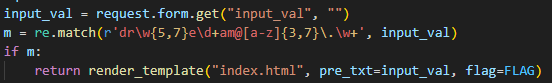 해당 코드는 input_val변수에 form.get을 통해 input박스의 값을 가져와 저장하고 저장된 값이 미리 정해둔 정규표현식과 매치가 될 경우 flag를 리턴하는 코드이다.