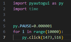 5번 라인에서 PAUSE의 속도를 최대한 적게 하여 빠르게 클릭이 가능하게 만들었다.