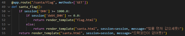 아래 그림은 /santa 페이지에서 flag구매를 선택하였을 경우 실행되는 코드이다.