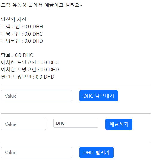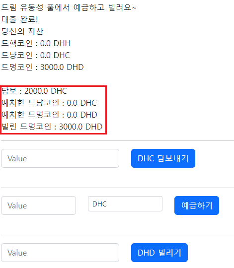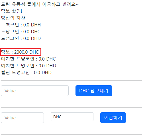 가지고 있는 DHC코인을 /dream페이지에서 담보로 하였다.