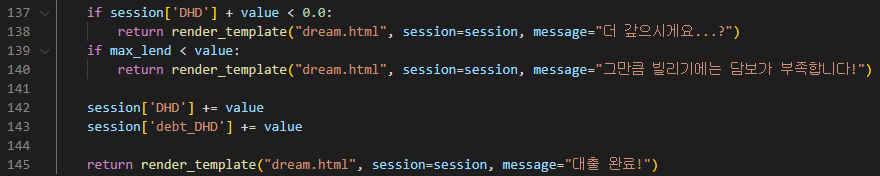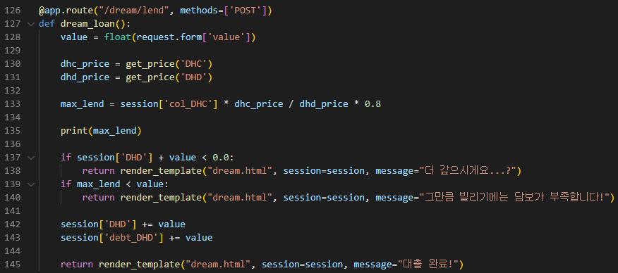 142~145: 위의 경우가 아닐 경우 DHD코인을 대출받는다.