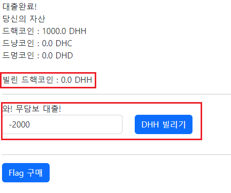 해당 문제는 여러 코인의 구매와 대출을 통해 DHH코인을 1000개를 모으고 빚이 없을 경우 플래그를 획득할 수 있는 문제이다.
