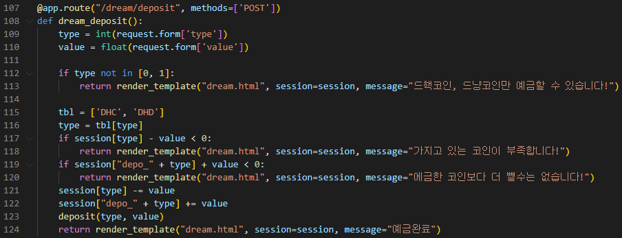 아래 그림은 /dream페이지에서 예금하기 버튼을 클릭했을 때 실행되는 코드이다.