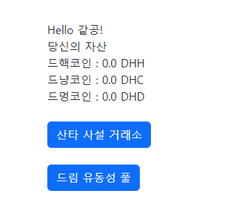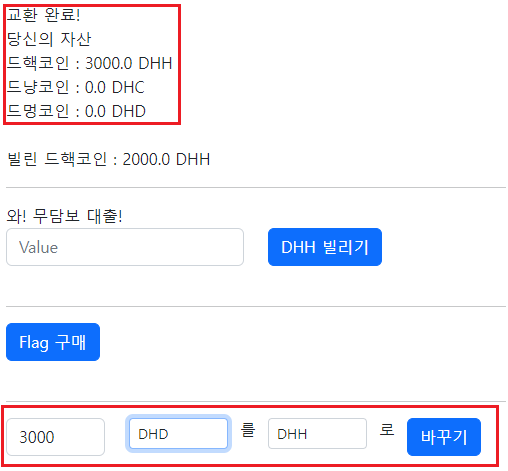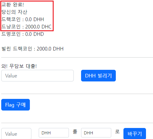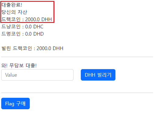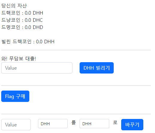 해당 페이지에서는 DHH코인을 빌릴 수 있으며 각 코인을 다른 코인으로 바꾸는 기능과 Flag를 구매할 수 있는 것을 확인할 수 있다.
